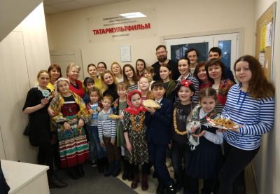 В гостях у студии побывала культурная команда Татарстана. Ребята – участники проекта #культурныйдневникшкольника и их родители поздравили коллектив студии #Татармультфильм с Широкой масленицей и Международным женским днем. Ребята устроили настоящее праздничное представление, с песнями, танцами, стихами, шутками, сладостями и главным угощением Масленицы – вкусными румяными блинами.